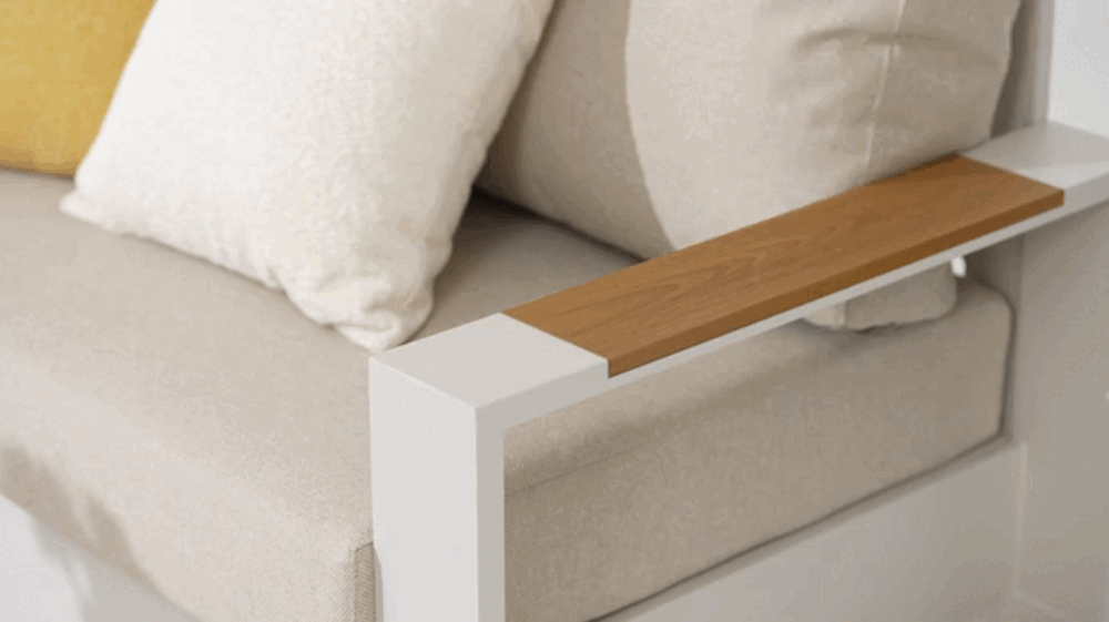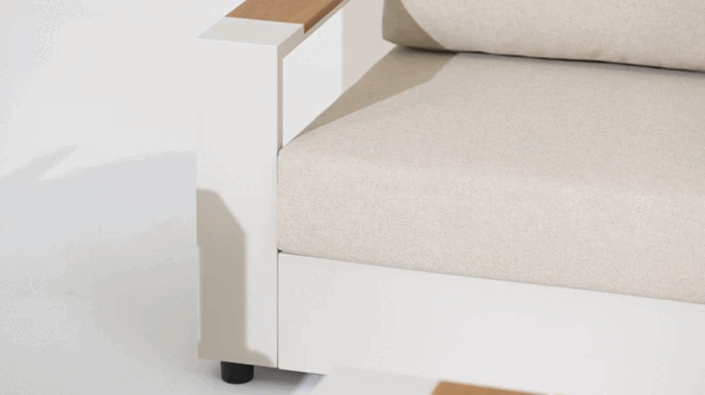 Addison is more than furniture—it’s a feeling. Revel in the golden outdoors as the Addison modern sofa set transforms your space into a sanctuary of serenity—crafted with a champagne powder-coat finish and natural wood armrests for elegant durability, paired with cloud-like white cushions that invite you to unwind, creating the perfect balance of refined style and laidback comfort for cherished moments under the open sky.