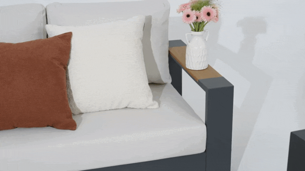 Addison is more than furniture—it’s a feeling. Revel in the golden outdoors as the Addison modern sofa set transforms your space into a sanctuary of serenity—crafted with a dark grey aluminum frame and natural wood armrests for elegant durability, paired with cloud-like white cushions that invite you to unwind, creating the perfect balance of refined style and laidback comfort for cherished moments under the open sky.