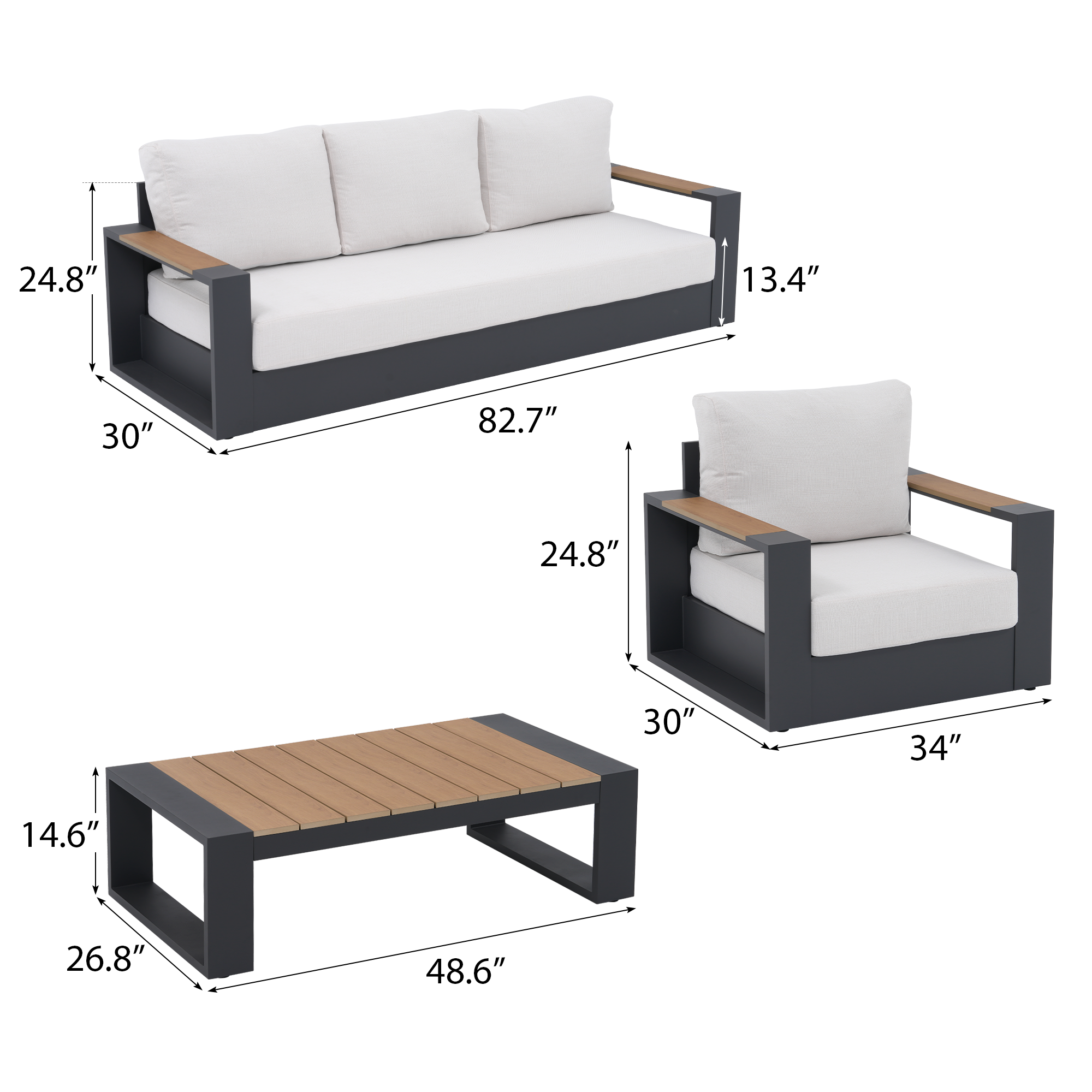 Addison is more than furniture—it’s a feeling. Revel in the golden outdoors as the Addison modern sofa set transforms your space into a sanctuary of serenity—crafted with a dark grey aluminum frame and natural wood armrests for elegant durability, paired with cloud-like white cushions that invite you to unwind, creating the perfect balance of refined style and laidback comfort for cherished moments under the open sky.