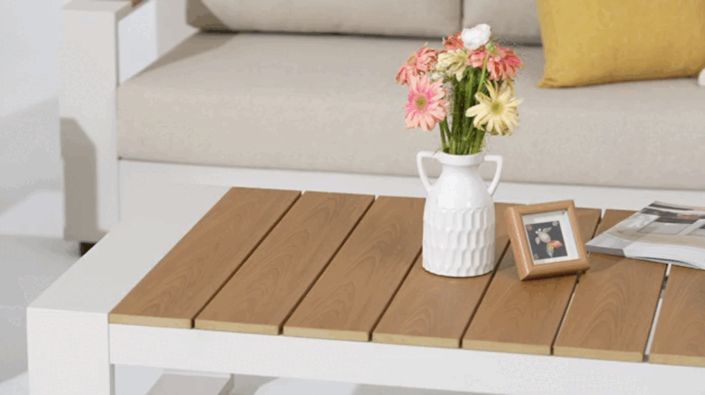 Addison is more than furniture—it’s a feeling. Revel in the golden outdoors as the Addison modern sofa set transforms your space into a sanctuary of serenity—crafted with a champagne powder-coat finish and natural wood armrests for elegant durability, paired with cloud-like white cushions that invite you to unwind, creating the perfect balance of refined style and laidback comfort for cherished moments under the open sky.