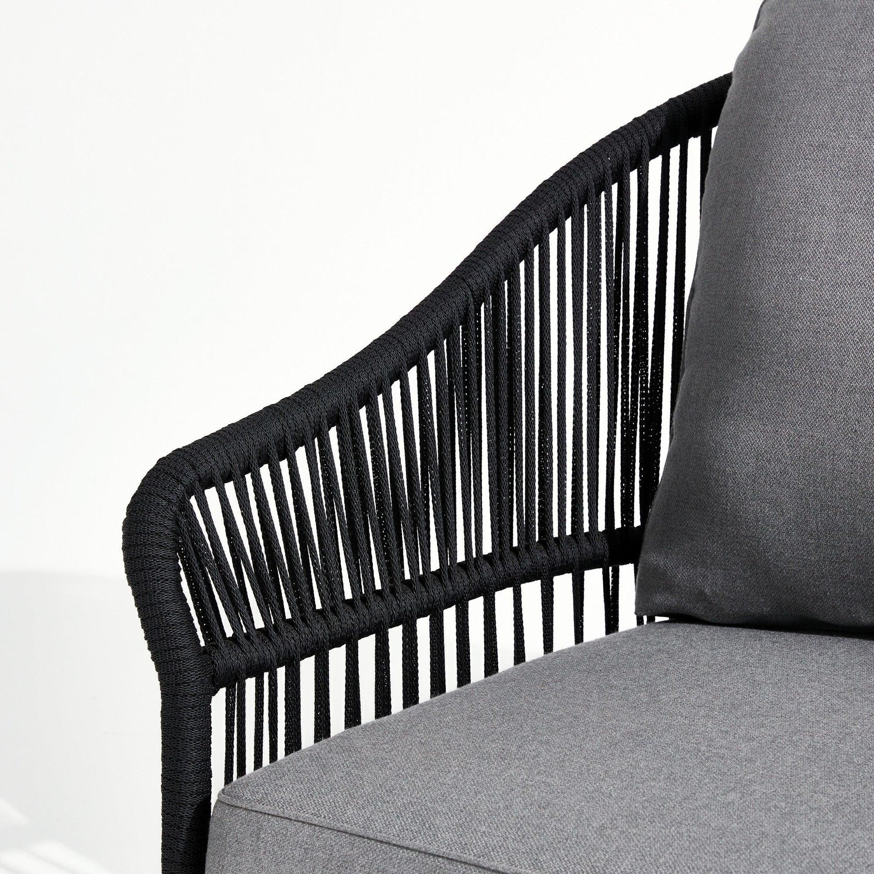 The Balboa Sofa is the very definition of luxury in outdoor seating—a treat for the senses with four-layered, soft, cozy cushions that feel like you're sitting on a cloud. The black aluminum frame is equally impressive with black rope accents—a truly comfortable way to sip a beverage, chat with friends and admire the outdoors or enhance your home, indoors.