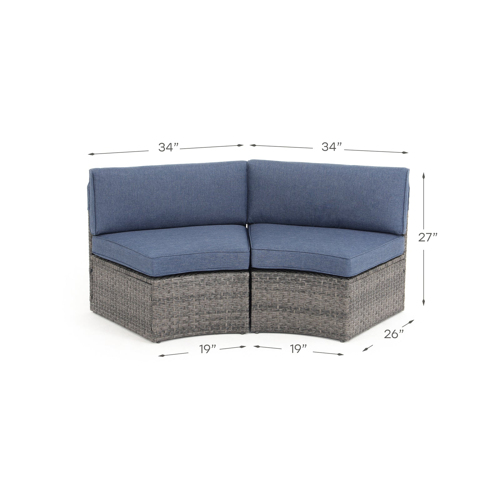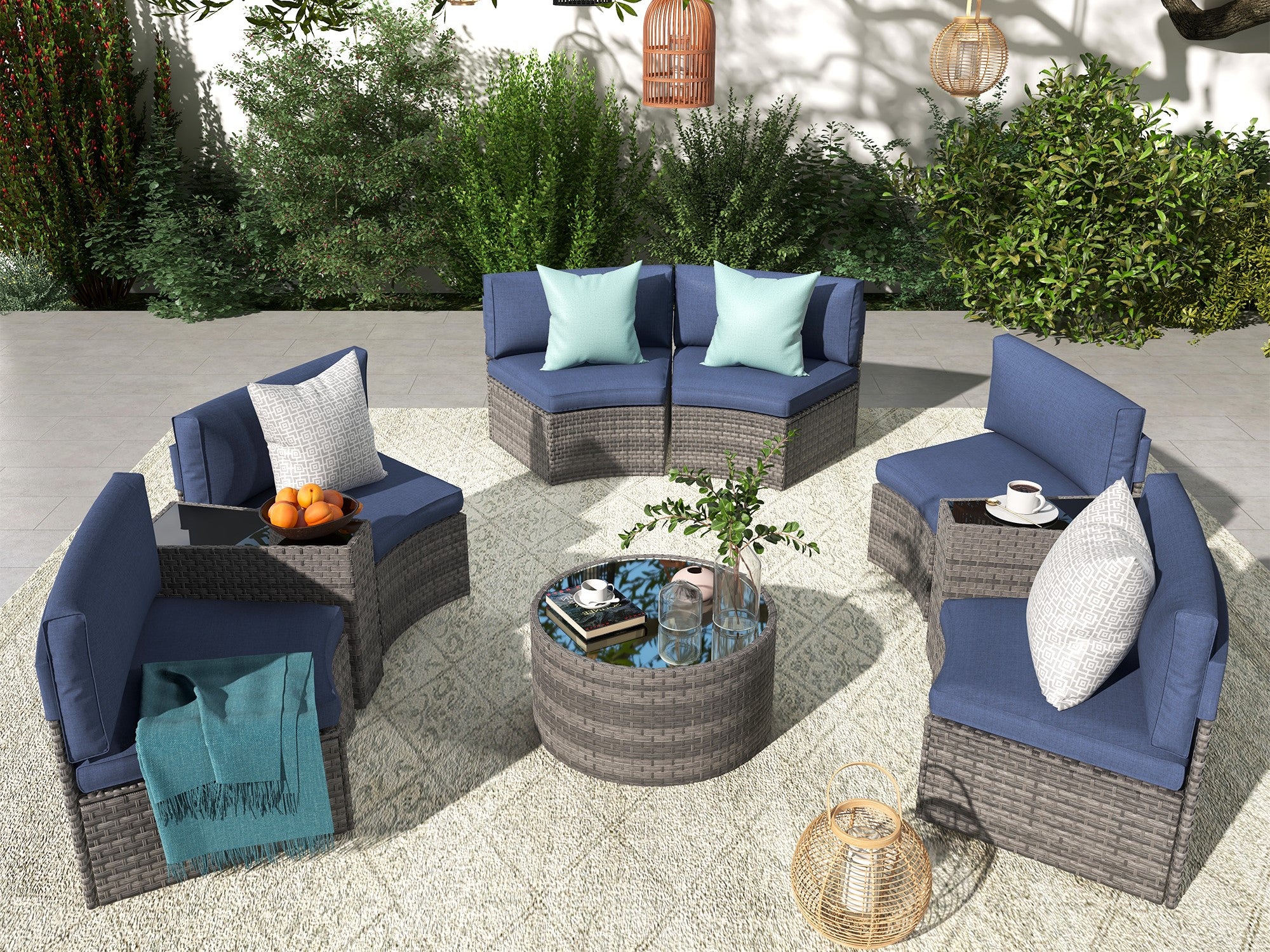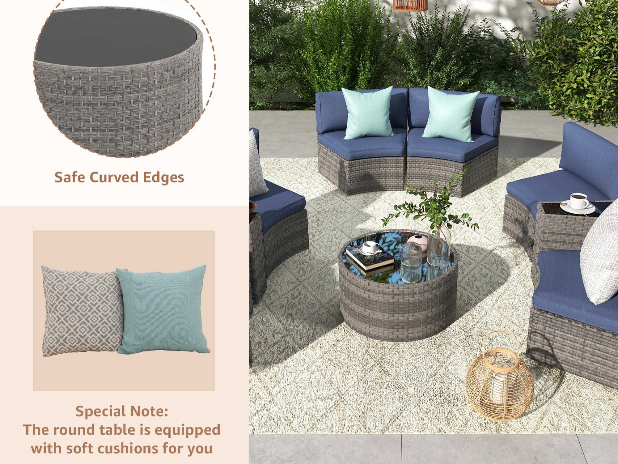 Boboli 9-pc Wicker Outdoor Curved Sectional Sofa Set w/ Round Glass Top Coffee Table
