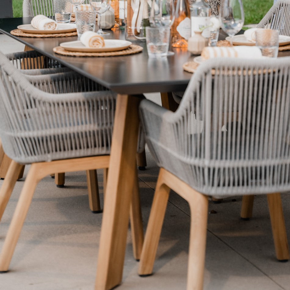 The Coronado Dining Chair is an artform rich with color—from its natural brown teak legs to its spectrum of grey rope accents and plush cushion. An outdoor dining chair that's as comfortable indoors as out, is perfectly crafted to hug your back and position your arms comfortably. Its four-layered cushion with special blend of luxurious acrylic fabric is as hardworking as it is lush—resistant to stains, wear and tear, and years of dinner parties.