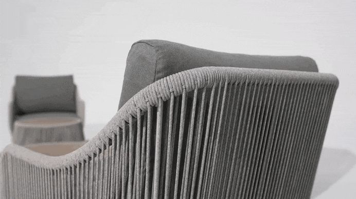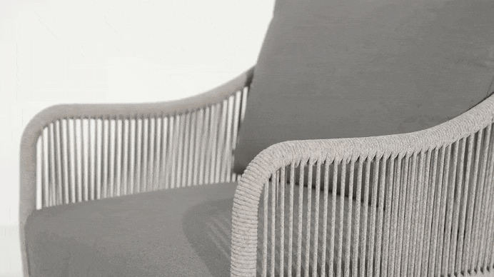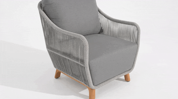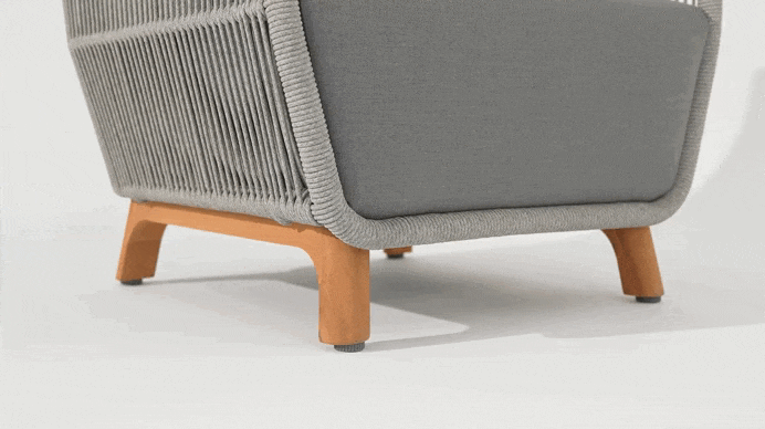 Luxury comes naturally to the single sofa/chair from the Natural Collection. Wrap yourself in four-layered cushion comfort, enveloped by light grey rope accents that reach around from back to front. Rich brown teak wood legs bring out the grey hues of both fabric and rope, and make for a bold patio chair that invites you to sit and stay—indoors or out.