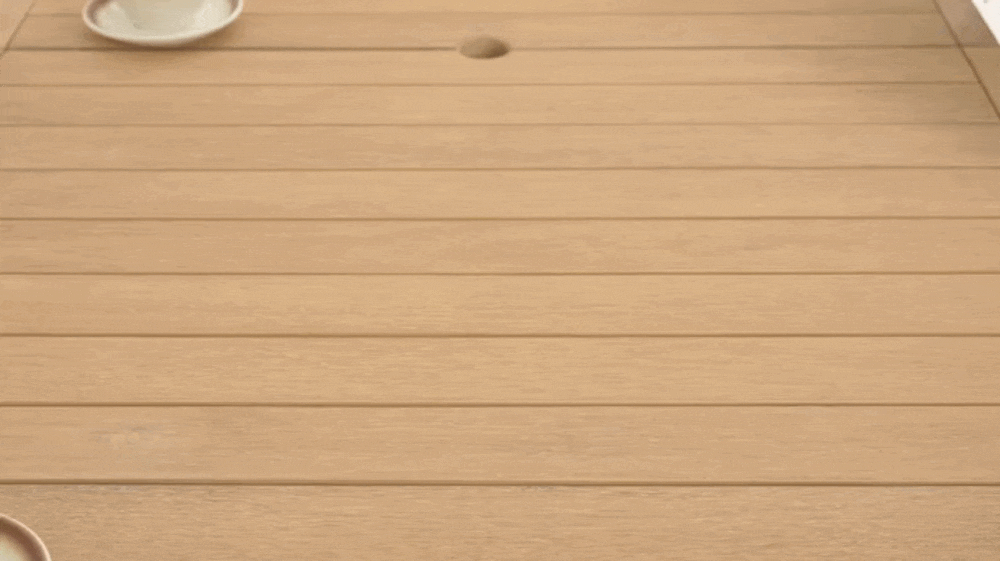 Lumi is an expression of outdoor calm. Designed for sun-filled spaces, the Lumi dining set with umbrella hole offers built-in shade without disrupting its clean, natural lines. Solid acacia wood and airy rope details create a warm foundation, while the integrated shade invites long lunches and relaxed conversations under open skies.