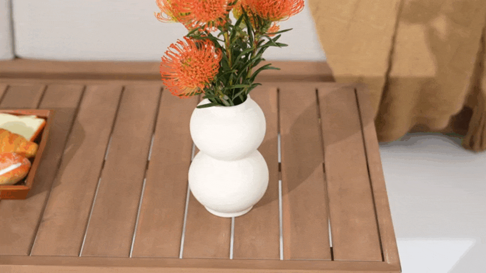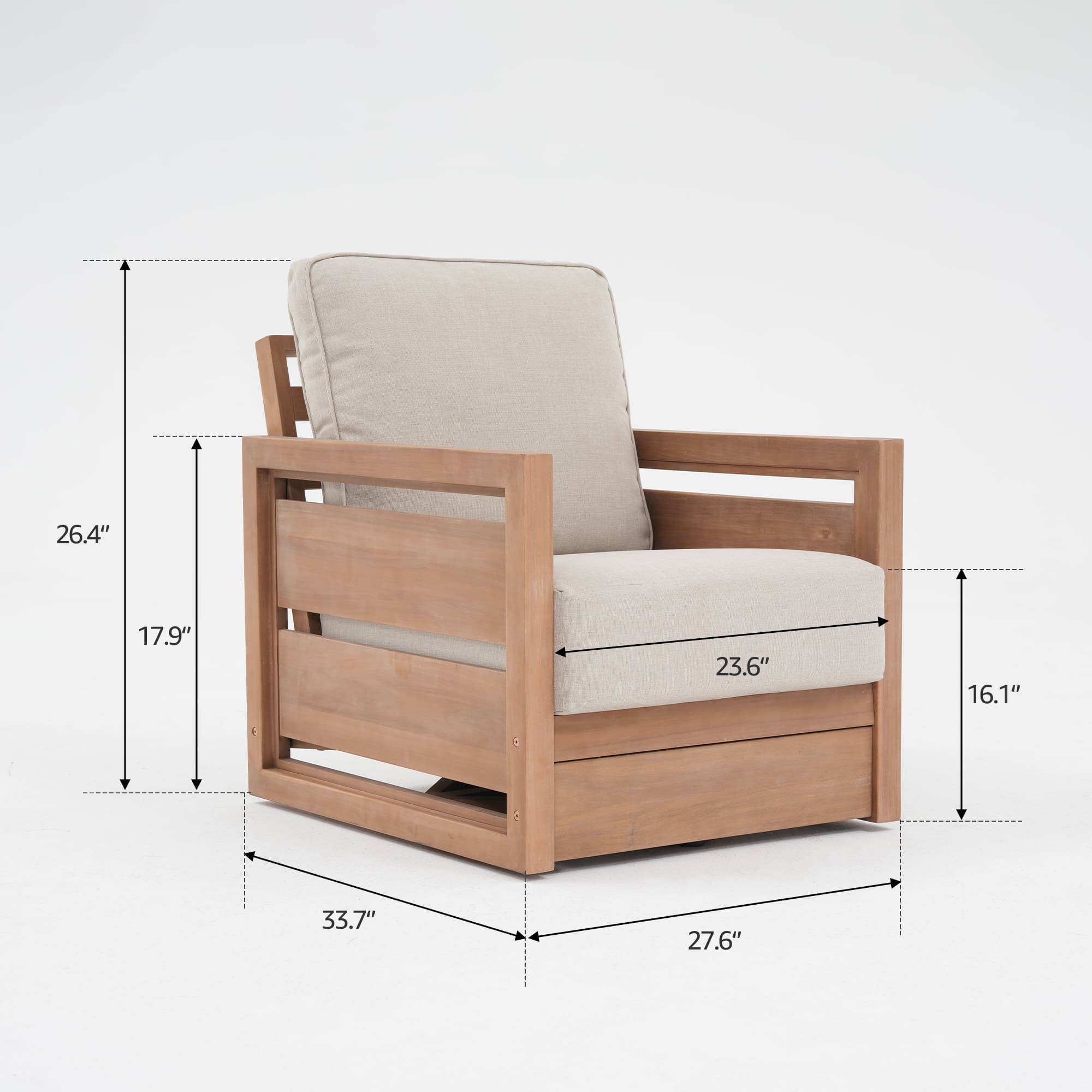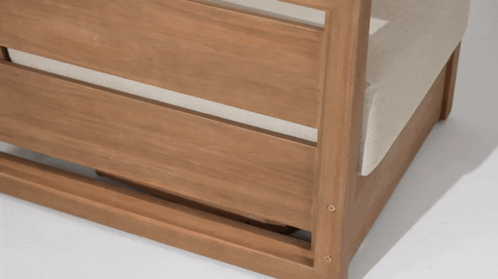 The Kiri Collection brings a warm, architectural calm to the outdoors. Crafted with extra-wide, deep solid wood seating and a 360° swivel single sofa, each piece exudes timeless comfort with a functional twist. Rounded armrests and natural wood grain merge seamlessly with plush, sun-resistant cushions in soft ivory, balancing organic warmth with relaxed sophistication. The palette—weathered oak and muted earth tones—forms a quiet, versatile foundation that complements both modern patios and lush garden settings.