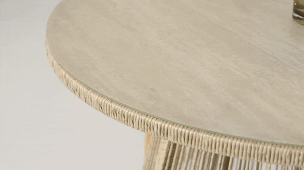 Crafted from durable acacia wood with Ergonomic Curved Nylon Lattice Back Dining Chairs, The NOTO Collection is designed for stylish comfort under the open sky. Centered around a round rattan-woven table topped with a tempered glass surface, it blends natural warmth with sleek functionality — the glass tabletop resists scratches and stains for easy cleaning, while the rattan base adds a touch of bohemian charm to your outdoor dining space.