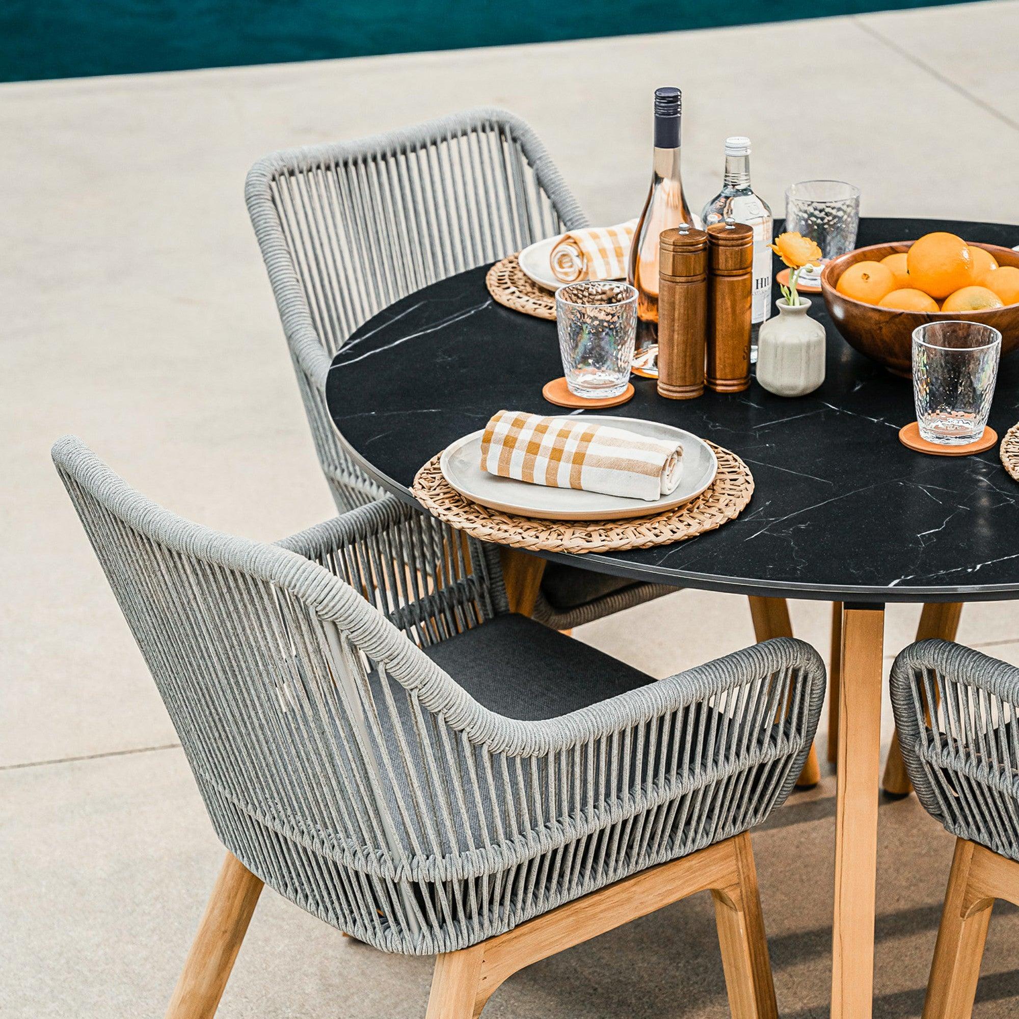 Think outside the box—the Round (Laguna Dining Table brings a circular experience to your great outdoors or home. Sized for dinner, drinks or snacks for a more intimate party, it works comfortably with four (Coronado Dining Chairs. Teak wood legs and sintered stone tabletop make this small but stunning dining or picnic table a perfect addition to smaller venues.