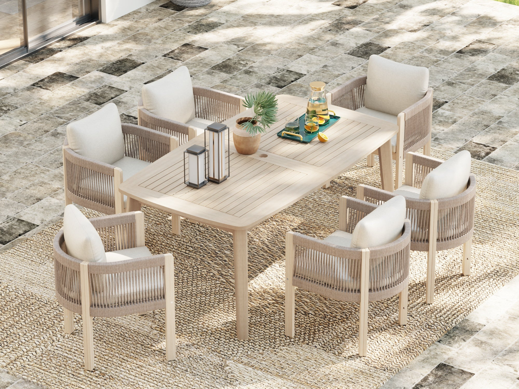 Crafted from 100% durable acacia wood, this table blends natural warmth with lasting resilience—perfect for sun-soaked patios and garden spaces. It features a built-in umbrella hole (ideal for shading summer meals) and comes in two versatile sizes, comfortably seating 4 to 8 guests (ideal for family dinners, weekend barbecues, or casual get-togethers). Thoughtfully designed with rounded edges, it adds a soft, safe touch to your outdoor setup while maintaining a sleek, modern silhouette. Whether dressed up for al fresco dinners or kept casual for morning coffee, this table turns any outdoor spot into a welcoming hub for connection.