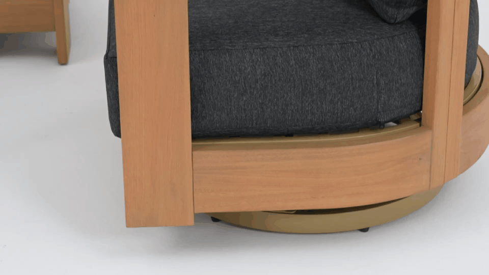 The Sova Collection blends modern lines with the warm texture of eucalyptus wood, creating a serene, sophisticated, and comfortably inviting outdoor lounge space. This Sova armchair—finished in rich teak and paired with plush black cushions—takes outdoor relaxation to the next level. It further features a 360-degree swivel function for enhanced convenience, letting you effortlessly turn to join a patio chat, soak up the garden view, or chase the perfect spot of shade. Pair it with a compact round side table, and you’ve got your go-to nook for savoring quiet morning coffee, flipping through a favorite book, or unwinding with an evening drink.