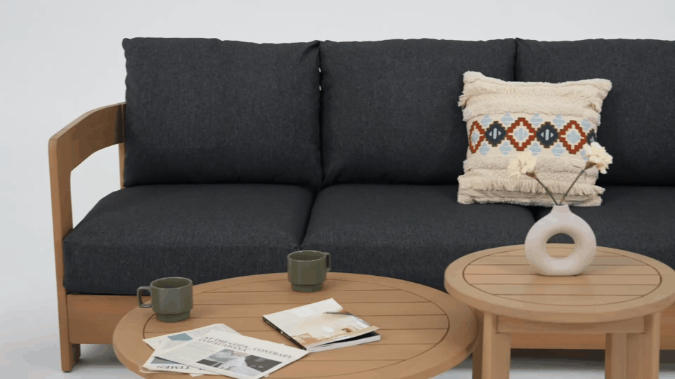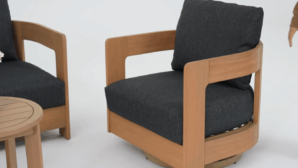 The Sova Collection blends modern lines with the warm texture of eucalyptus wood, creating a serene, sophisticated, and comfortably inviting outdoor lounge space. Offered in rich teak finishes and paired with plush light-toned cushions, each piece brings understated contrast and everyday comfort to your patio. This Sova armchair further features a 360-degree swivel function for enhanced convenience—letting you effortlessly pivot to join the conversation or soak in the garden view. Pair it with a set of two round side tables and you’ll have a perfectly curated setup for placing drinks, snacks, or a good book, turning your outdoor area into a cozy, functional retreat for relaxing and connecting with loved ones.