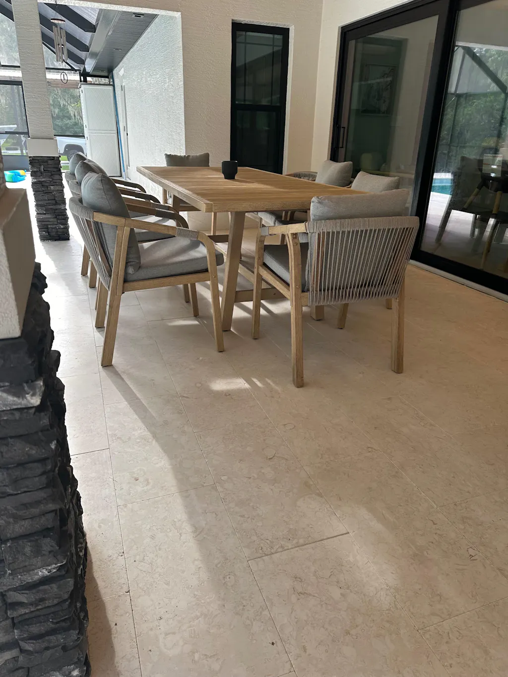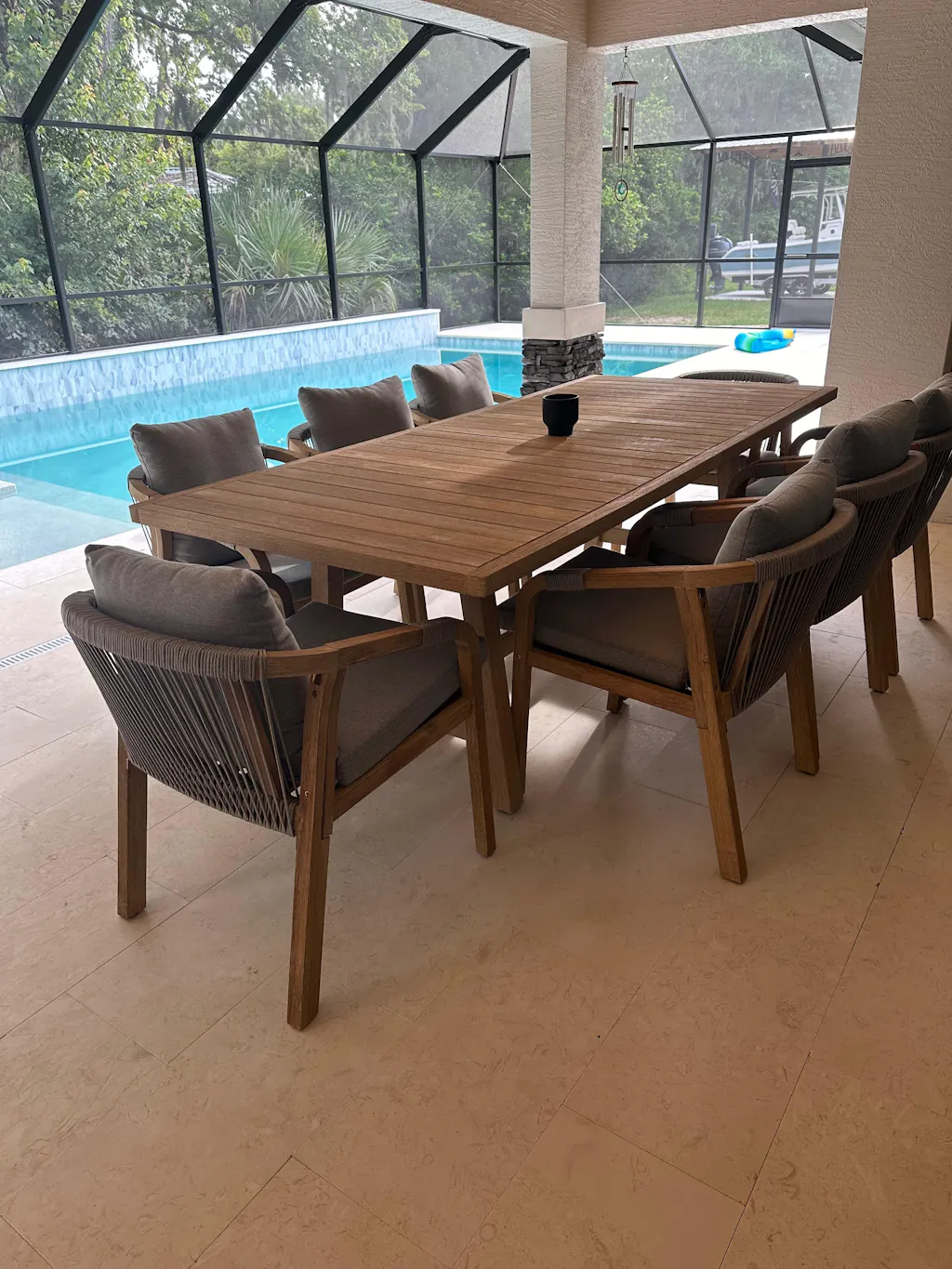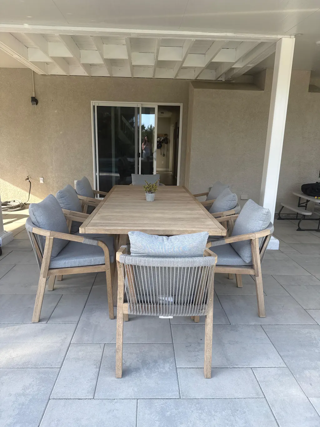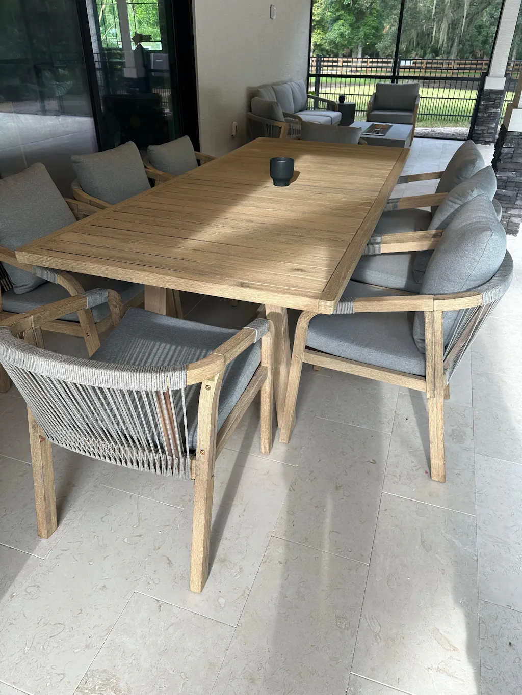 The 'Thalea' collection defines the essence of contemporary outdoor design. The Thalea 8-Seater Dining Set blends minimalist elegance with functional design. Featuring a sleek rectangular acacia wood table and eight matching chairs, this ensemble embodies understated luxury with its smoke-white palette and precision craftsmanship. Designed for seamless outdoor living, the set balances modern aesthetics with lasting resilience.