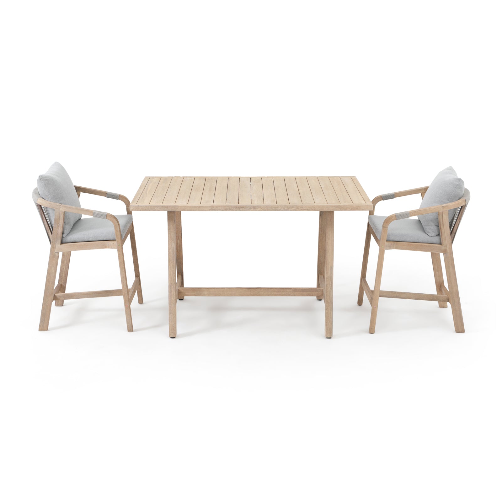 The 'Thalea' collection defines the essence of contemporary outdoor design. The Thalea Wooden Bar Table redefines outdoor entertaining with its striking wire-brush finished acacia surface, showcasing organic texture within a minimalist silhouette. The 62.5" span balances generous hosting space with sleek proportionality, embodying Thalea's signature fusion of rugged durability and refined modernism.