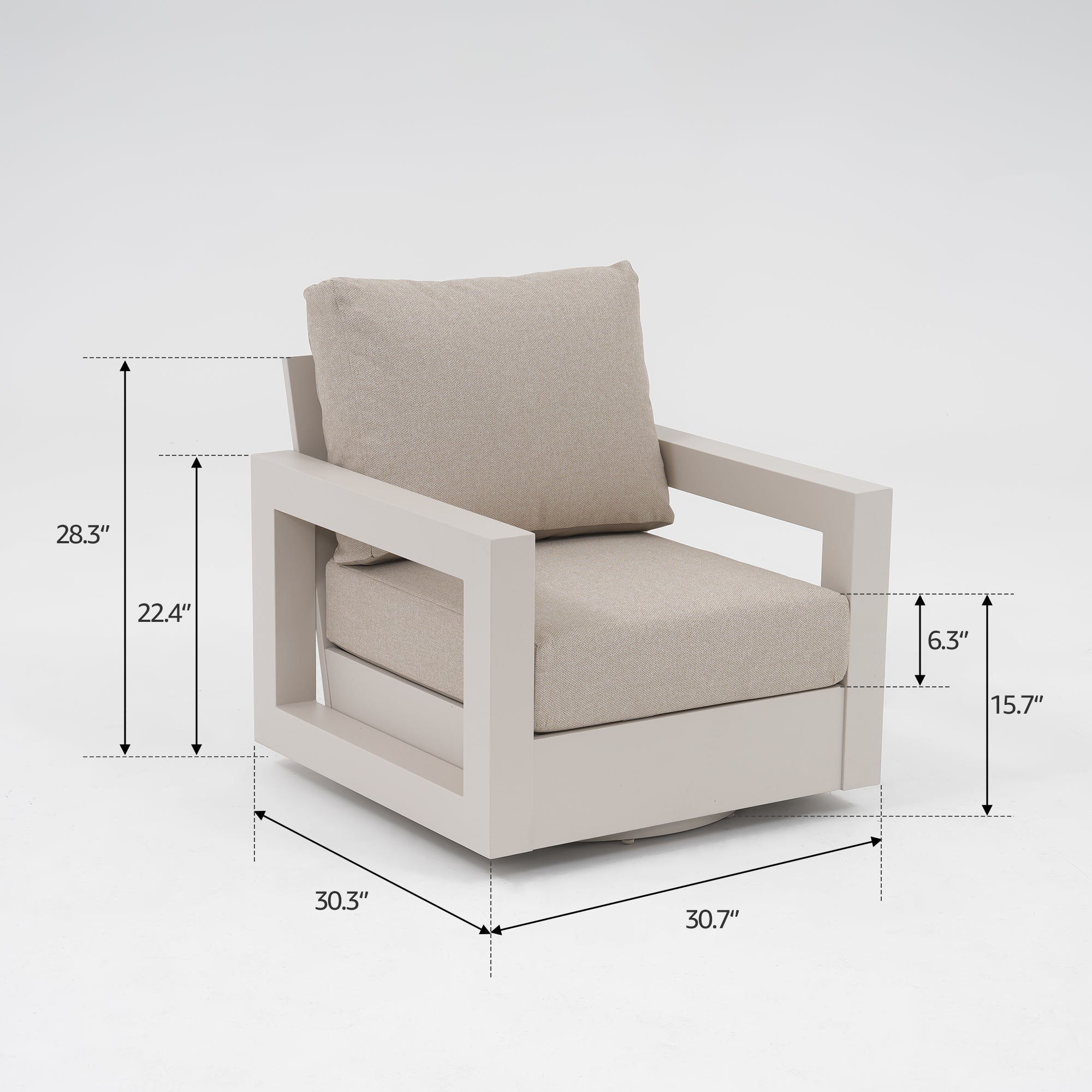Vela Modern Metal Outdoor Sofa Set with Swivel Chairs, Light Beige Fire Pit,Linen Cushions