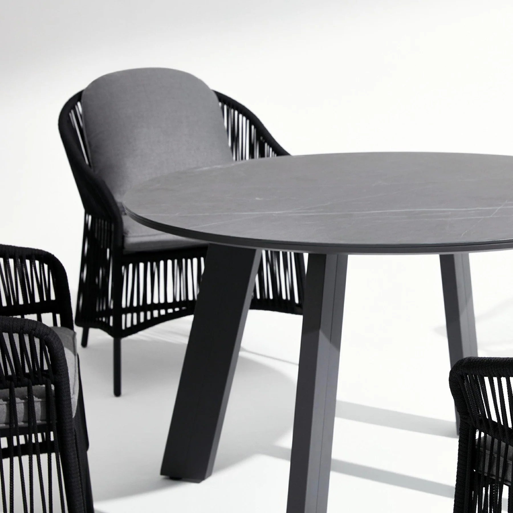 Feel the Wonder Collection difference with our specially blended four-layered acrylic fabric, designed for the ultimate in luxury and long life, treated to protect against sun fading, spills, weather and mold. Black textiline rope accents take an already elegant outdoor patio chair to the very next level. The Round Mission Dining Table brings a great deal to the table—including sintered stone and sturdy aluminum frame with dark gray legs. This outdoor dining table is a small wonder that makes food or drinks outside—or in—a pure pleasure.